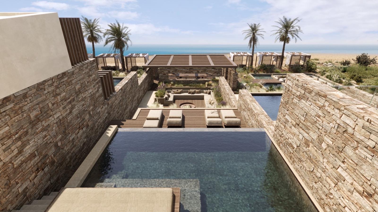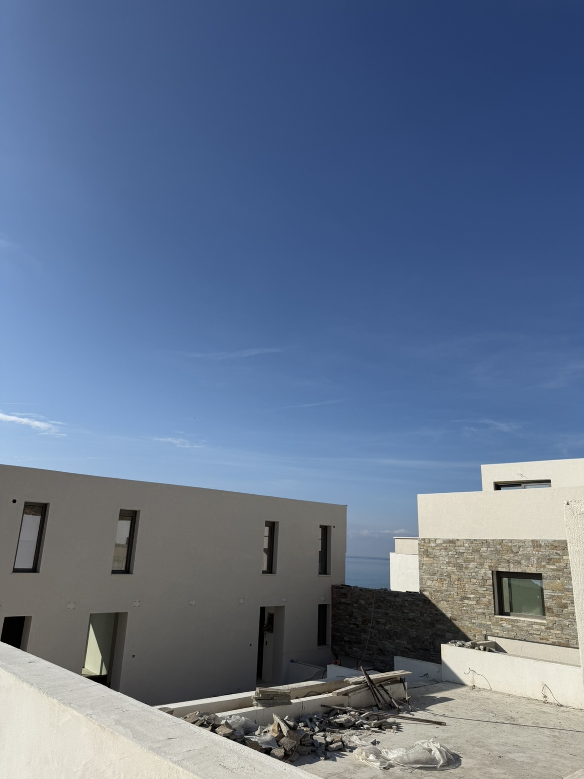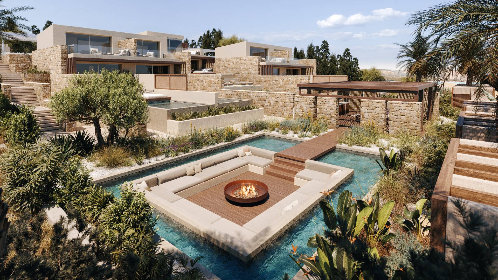 The architecture of the complex is characterized by clean lines and strict geometry, with respect for the natural environment and the scale of the location. The materials selected reinforce the timeless character of the construction: reinforced concrete as the structural framework, plaster finishes that provide brightness and visual calmness, local stone that grounds the whole in its surroundings, and glass that allows natural light and views to penetrate deep into the interior, shaping an experience of constant contact with the sea and light.