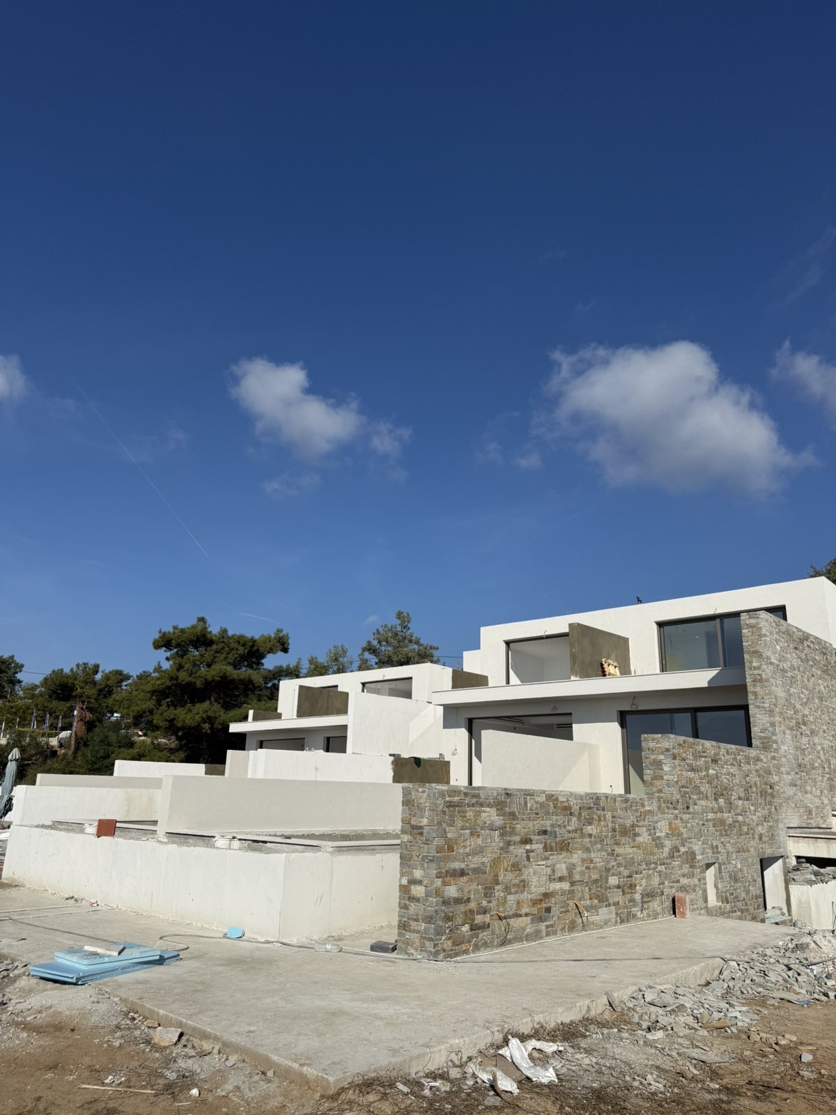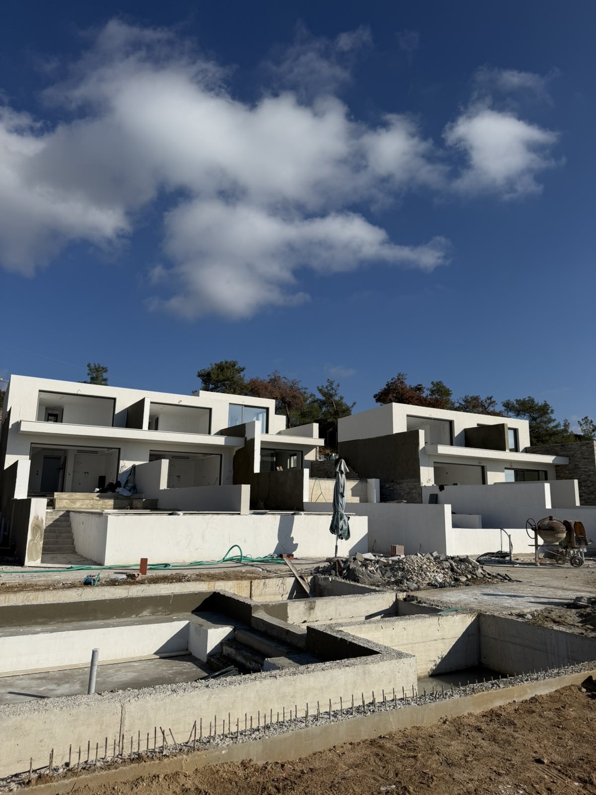 In the coastal area of Limenaria in Thassos, in direct proximity to the sea, a complex of modern single-family residences was created, with a total gross area of 1,000 sq.m., aiming to harmonize contemporary living with the natural landscape. The composition fully utilizes the privileged location of the plot, offering unobstructed views, privacy, and a tranquil experience.