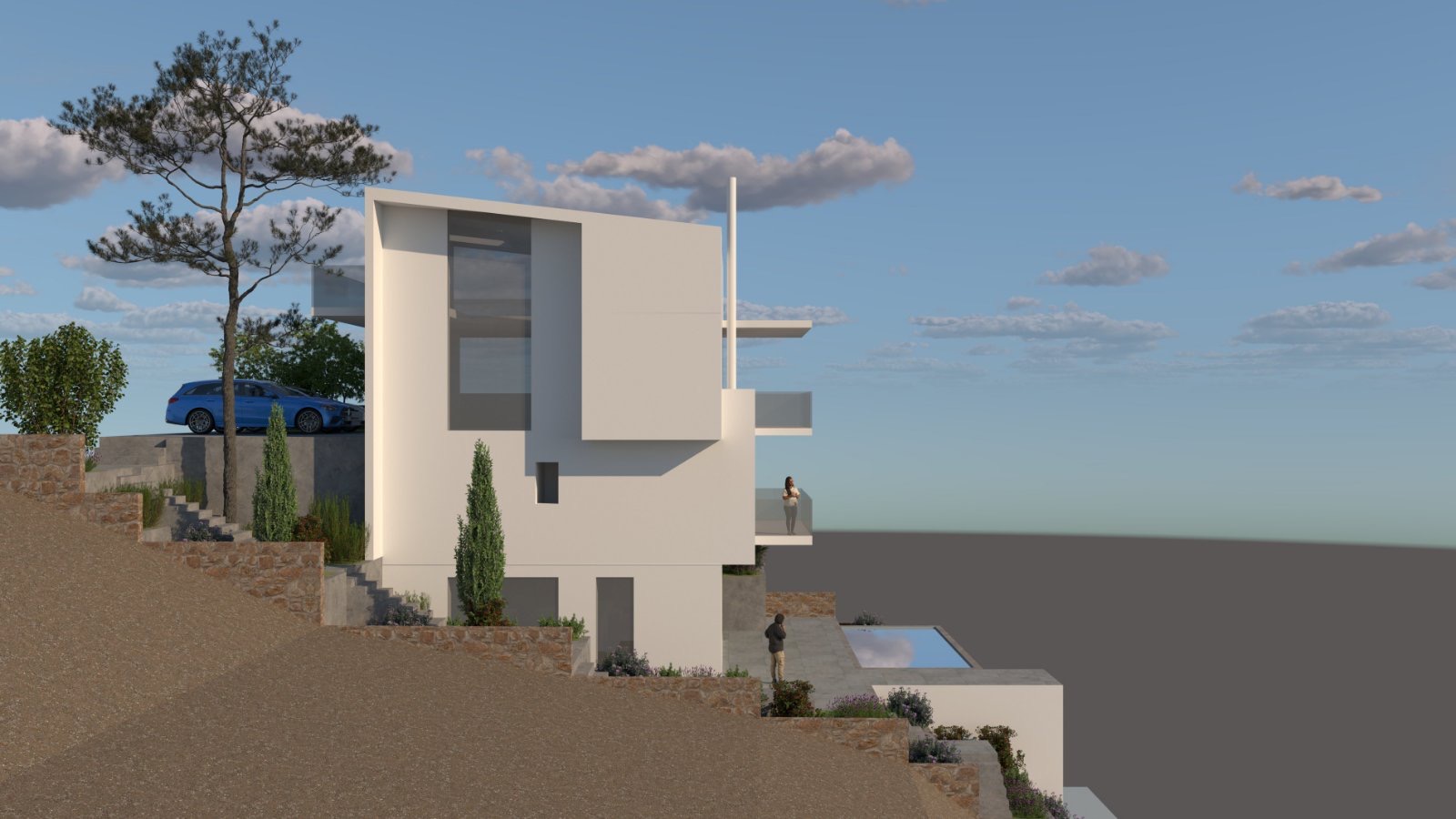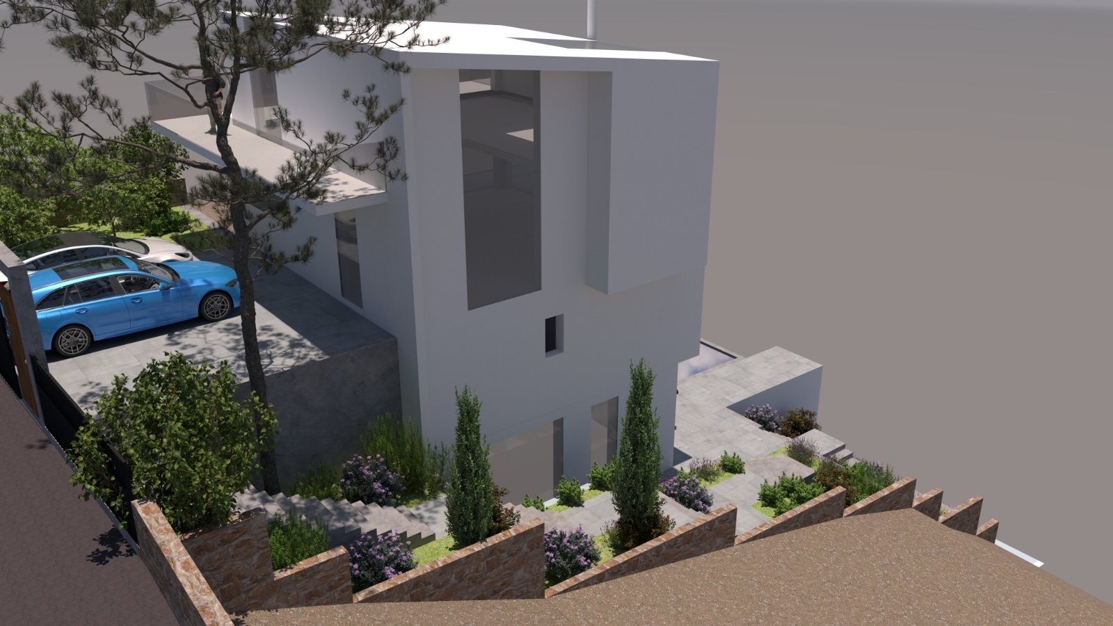 The steep slope of the ground led to the development of the project on multiple levels, in a way that integrates the architecture harmoniously into the terrain of the area and allows for maximum utilization of natural light and views.