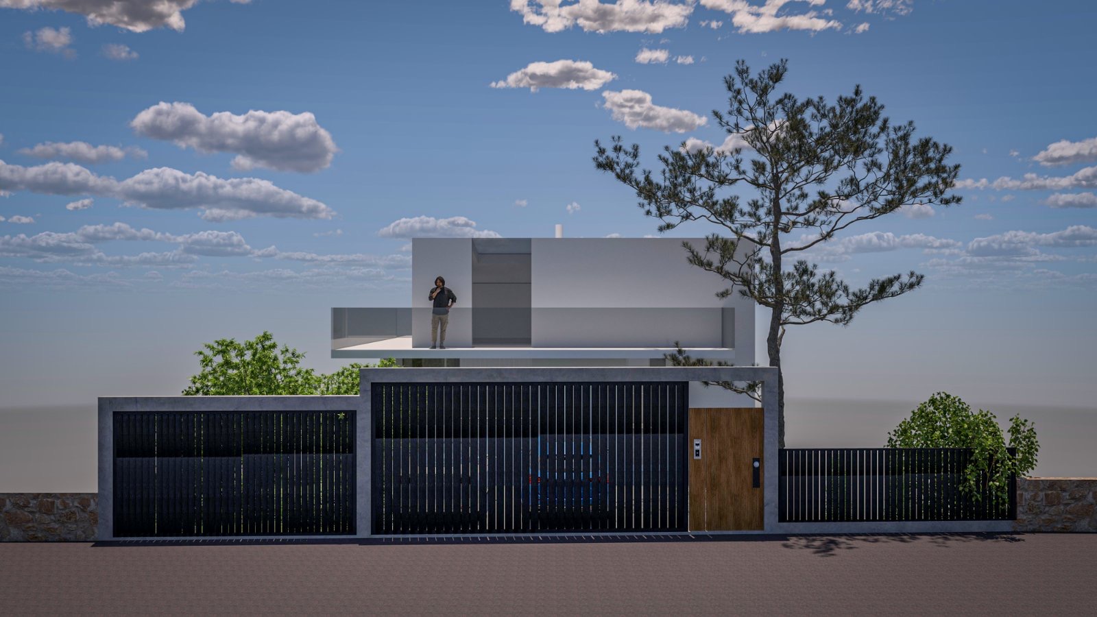 The entire residence is spread over a ground floor, an upper floor, and split-level basements, with each level occupying approximately 120 sq.m., while the outdoor area includes a 20 sq.m. swimming pool in direct connection with the main living areas. Particular emphasis was placed on the use of environmentally friendly and fire-resistant materials, adapted to the requirements of the area and the project itself. The construction is dominated by reinforced concrete, plastered brickwork, transparent glass, and natural wood, in a balanced coexistence of materials that offer solidity, transparency, and warmth.